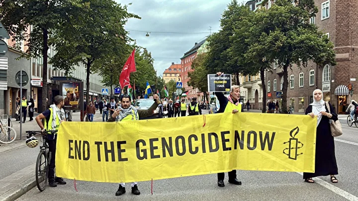 “Bu bir savaş değil, soykırım”, “Özgür Filistin”, “Katil İsrail”, “Direniş, özgürlük, adalet ve yeniden yapılanma” sloganları atan İsveçliler “Soykırımı durdurun” mesajı verdi.