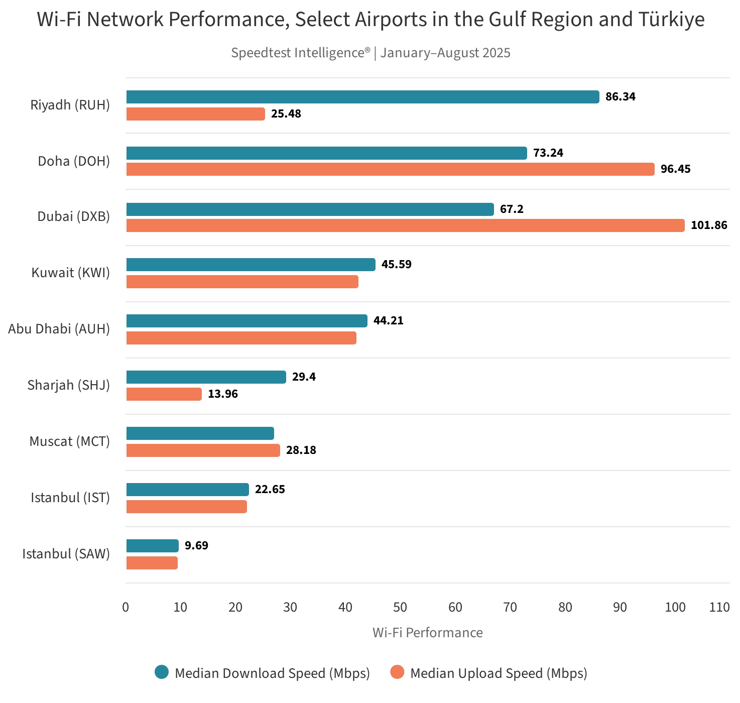 Listenin ilk sırasında ortalama 86,34 Mbps indirme hızı ile Suudi Arabistan’ın başkentindeki Riyad Kral Halid Uluslararası Havalimanı ve ortalama 101,86 Mbps yükleme hızı ile Birleşik Arap Emirlikleri’ndeki Dubai Uluslararası Havalimanı yer aldı.